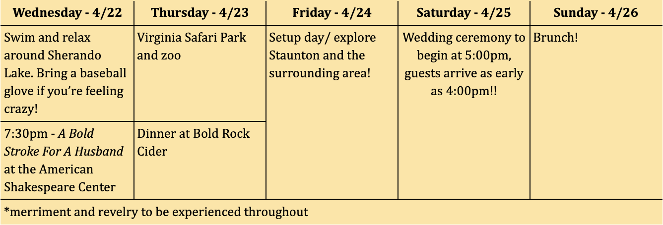 We would love for you to join us in the days leading up to the wedding as we explore Staunton, Charlottesville, and the surrounding area! Check out our general itinerary for on The Day, and lower down see what we’ll be doing the week before.